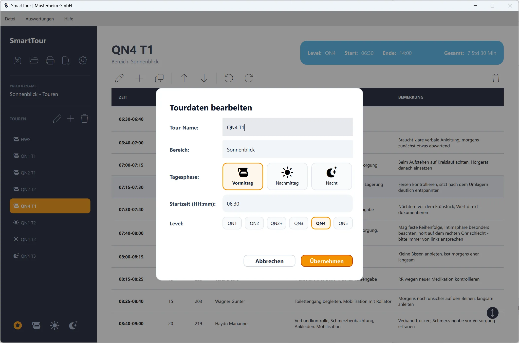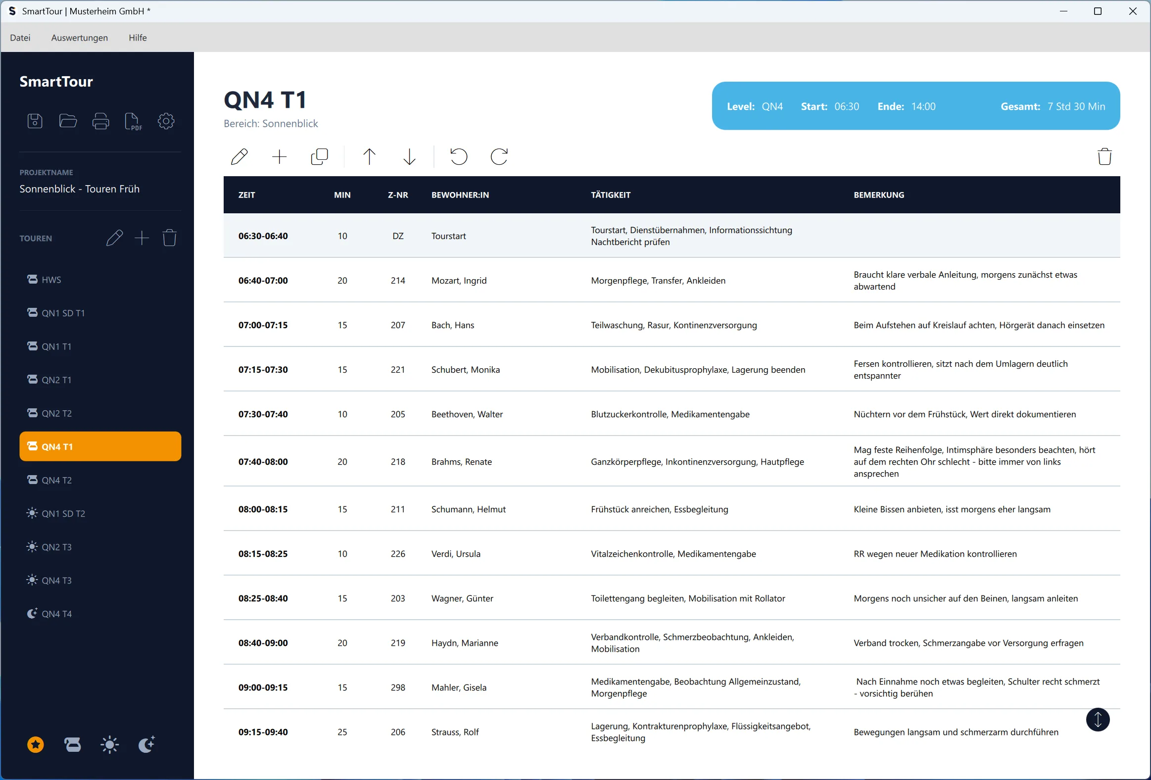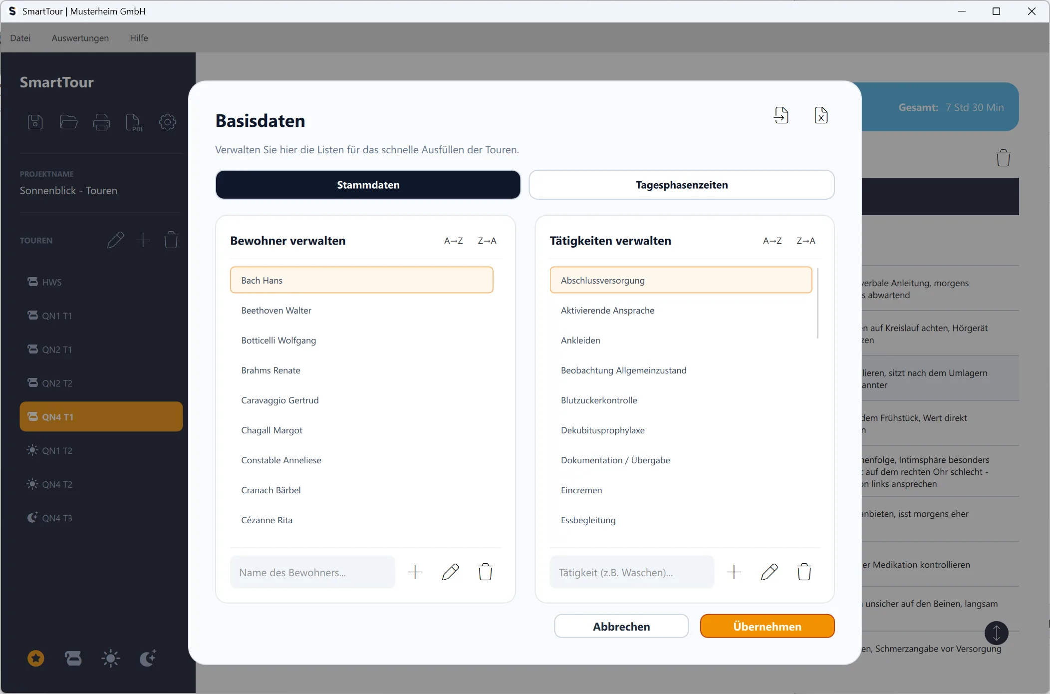 Die Namen der Bewohner:innen und Tätigkeiten können als Basisdaten hinterlegt und später bequem per Klick eingefügt werden. Ergänzend sorgen Touren-Statistik, Touren-Übersicht, Benutzerverwaltung, Passwortschutz, Projektverlauf mit Wiederherstellung und Audit-Log für mehr Kontrolle, Sicherheit und Transparenz.
