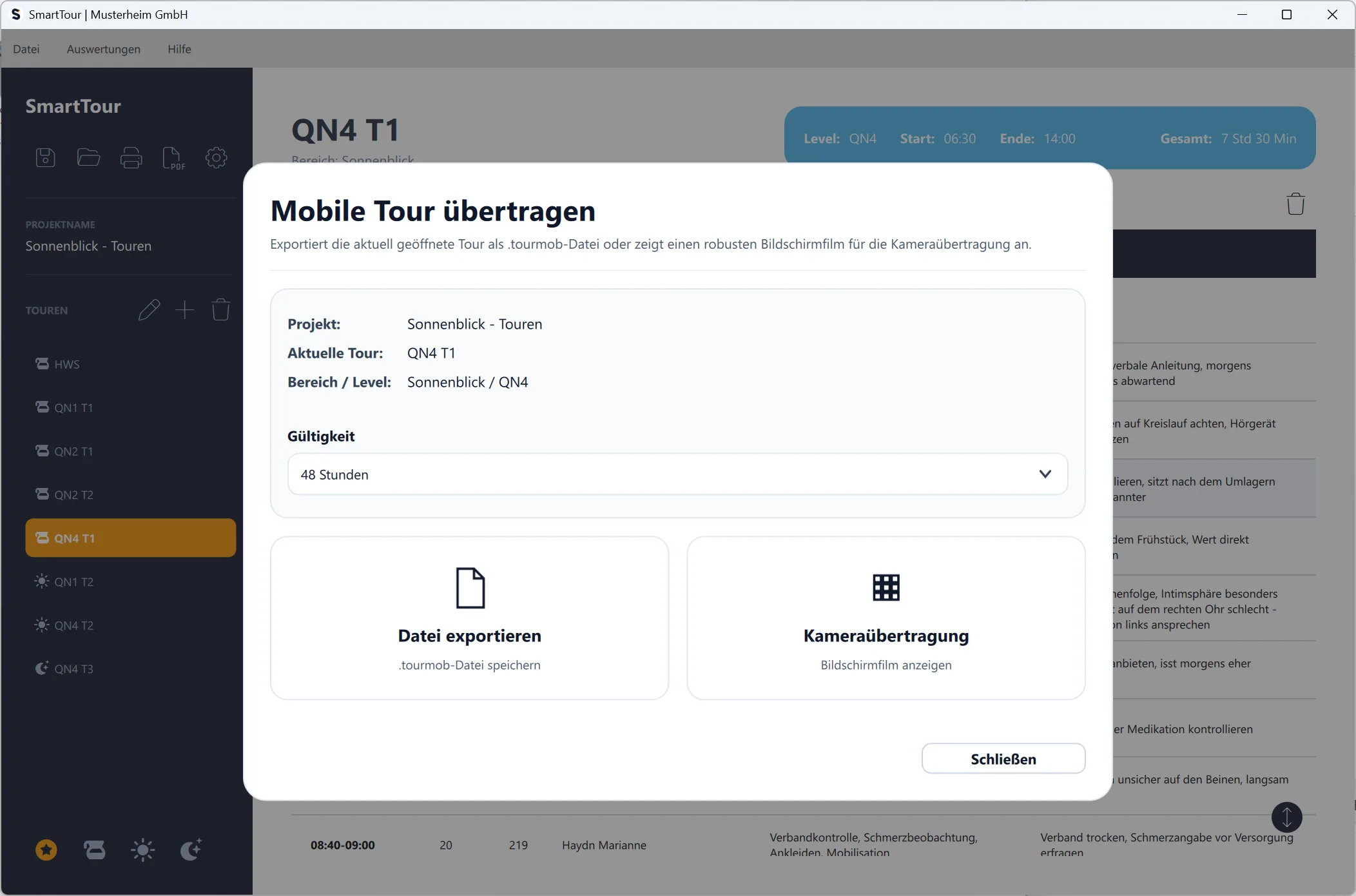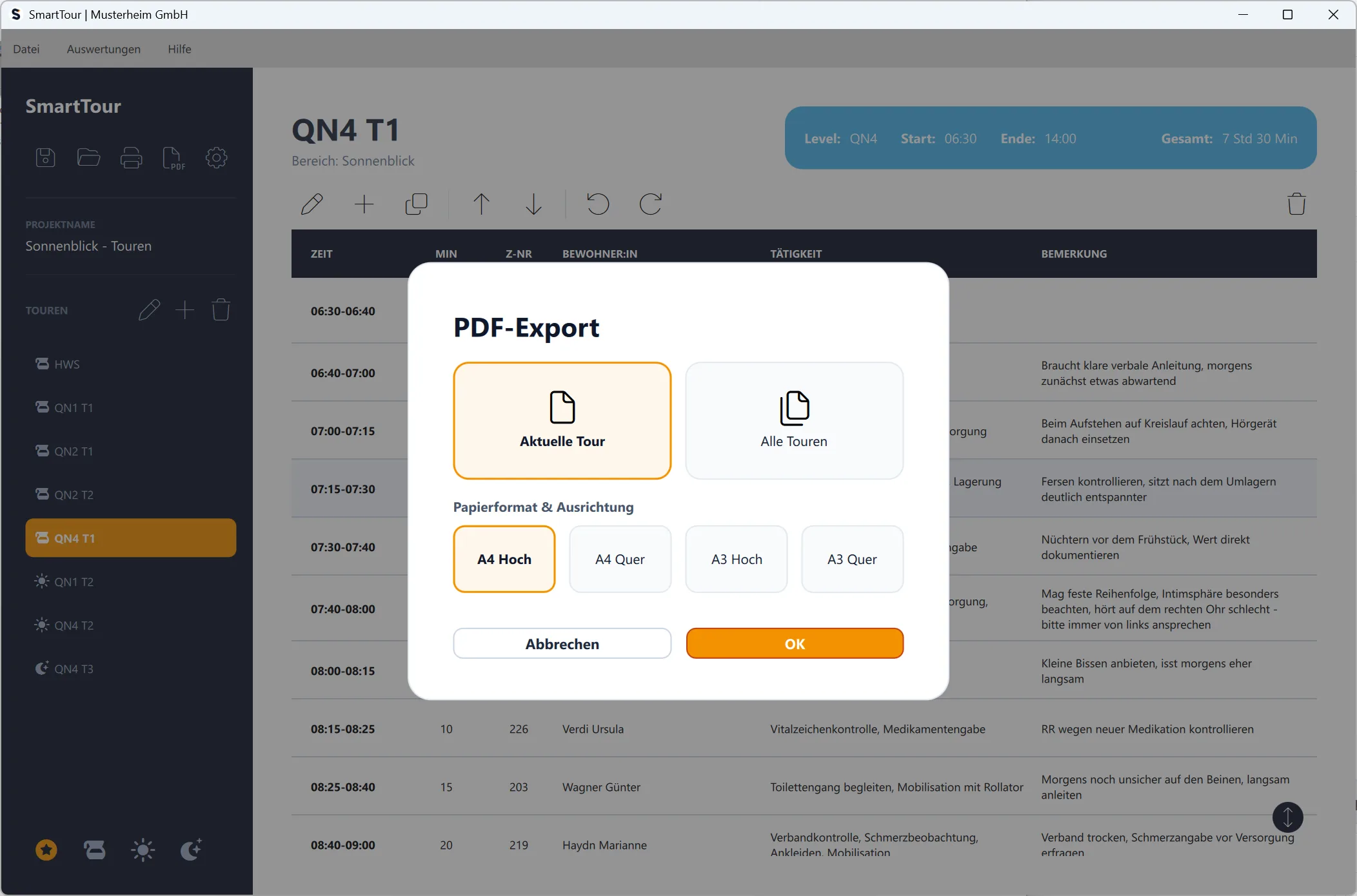 Nicht jedes Heim arbeitet gleich. Deshalb können Touren mit SmartTour als Ausdruck, als PDF oder mobil mit SmartTour Mobil auf Tablet und Smartphone genutzt werden. So passt sich die Lösung an Ihre Arbeitsweise an — nicht umgekehrt.