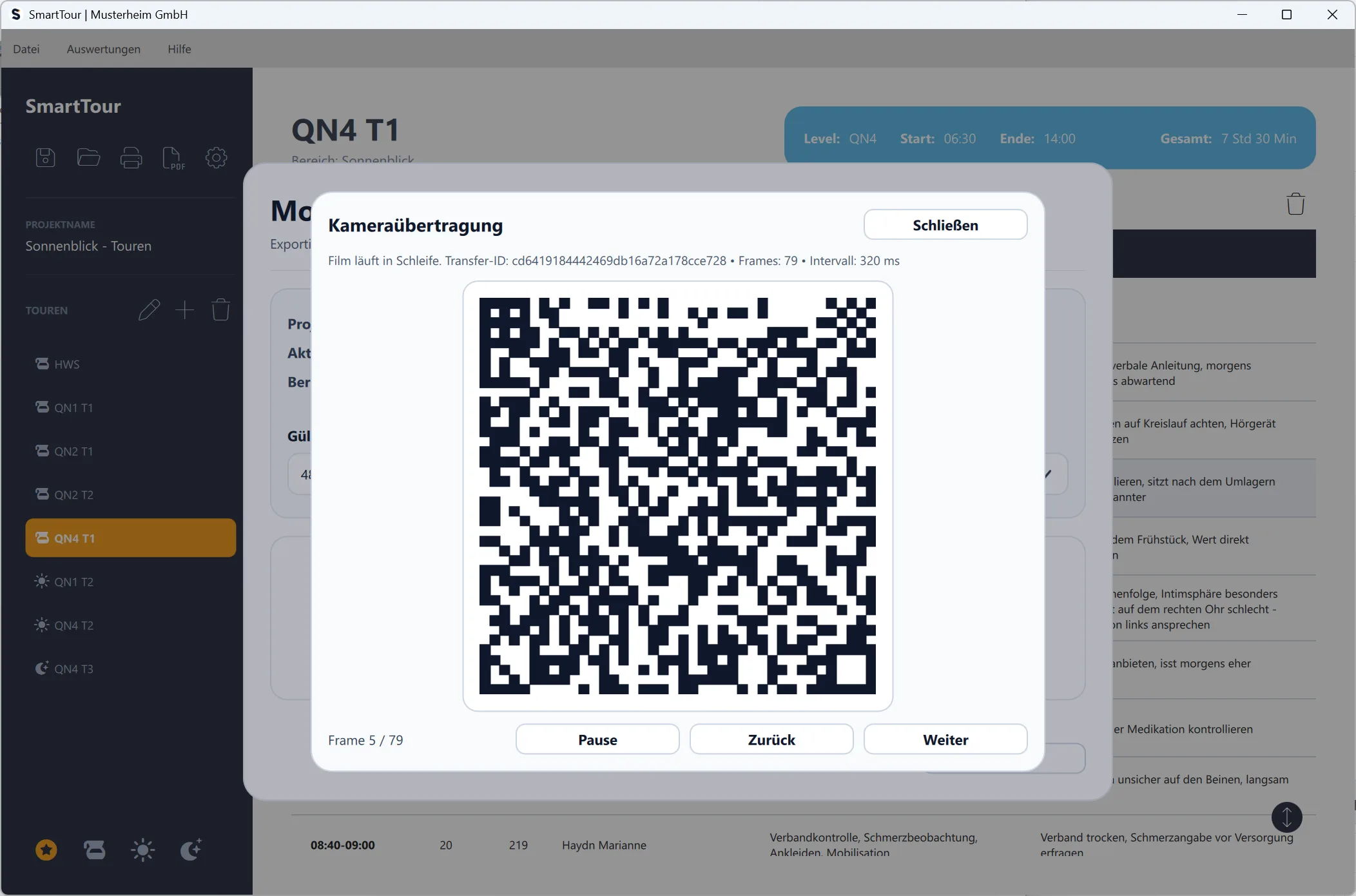 Die Touren können entweder als Datei oder per visueller QR-Code-Übertragung aus SmartTour übernommen werden. Dabei hält man das mobile Gerät einfach vor den Bildschirm, auf dem SmartTour den QR-Code-Film anzeigt – nach kurzer Zeit ist die Tour übertragen und einsatzbereit.
